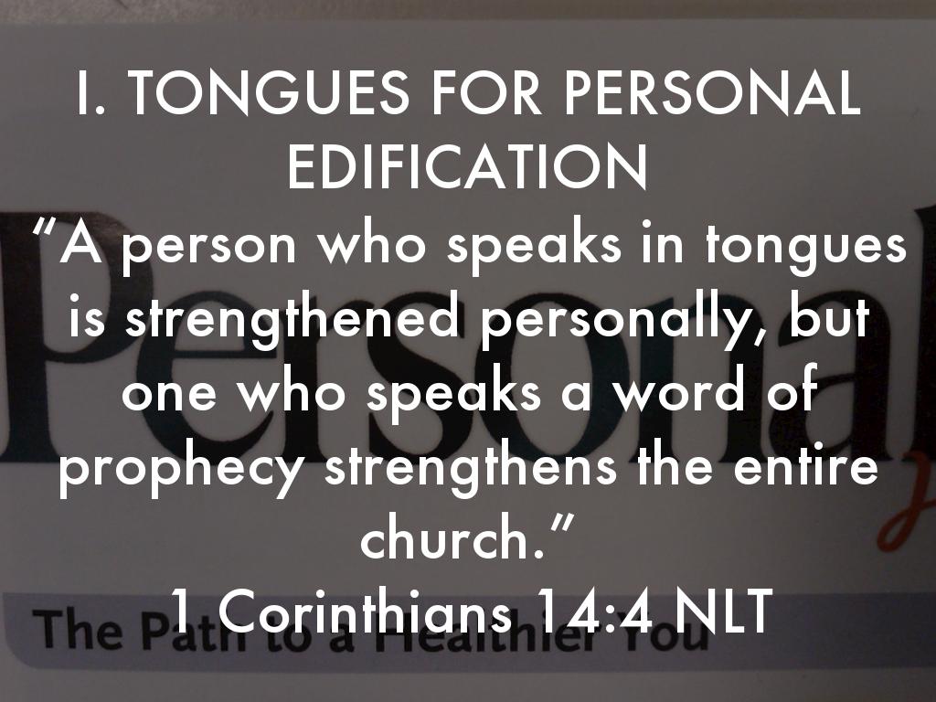 I. TONGUES FOR PERSONAL EDIFICATION “A person who speaks in tongues is strengthened personally, but one who speaks a word of prophecy strengthens the entire church.” 1 Corinthians 14:4 NLT