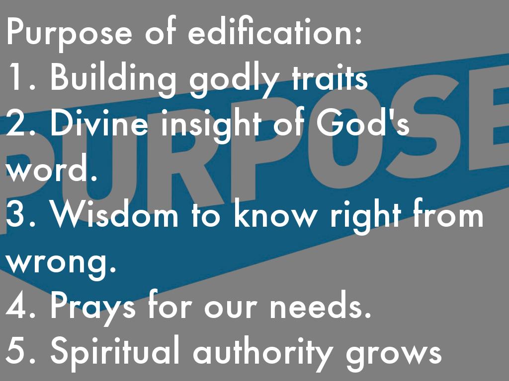 Purpose of edification: 1. Building godly traits 2. Divine insight of God's word. 3. Wisdom to know right from wrong. 4. Prays for our needs. 5. Spiritual authority grows
