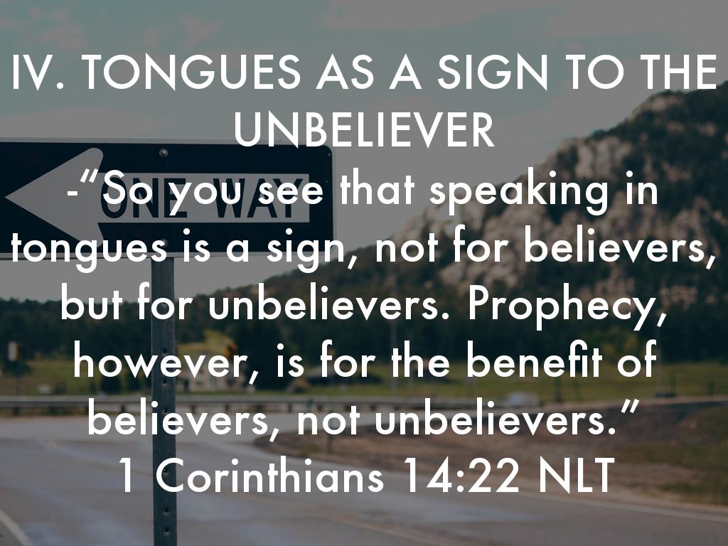 IV. TONGUES AS A SIGN TO THE UNBELIEVER -“So you see that speaking in tongues is a sign, not for believers, but for unbelievers. Prophecy, however, is for the benefit of believers, not unbelievers.” 1 Corinthians 14:22 NLT