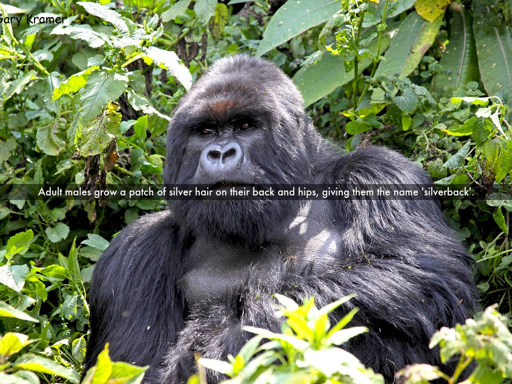Adult males grow a patch of silver hair on their back and hips, giving them the name 'silverback'.
