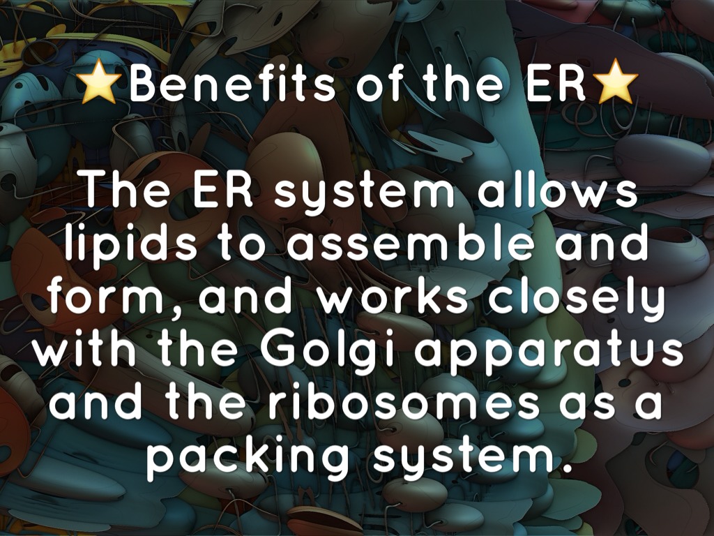 The ER system allows lipids to assemble and form, and works closely with the Golgi apparatus and the ribosomes as a packing system.