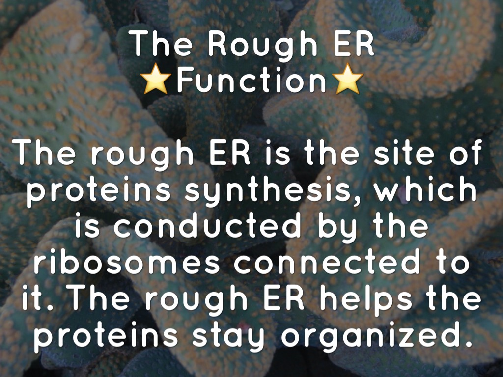 The rough ER is the site of proteins synthesis, which is conducted by the ribosomes connected to it. The rough ER helps the proteins stay organized.