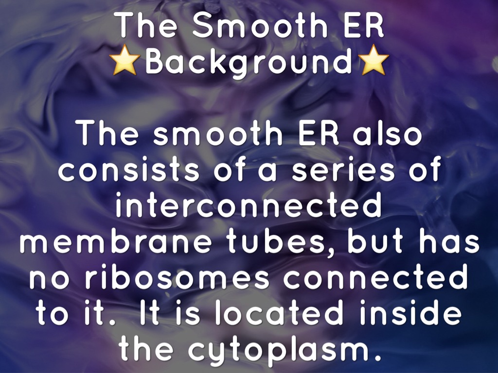 The smooth ER also consists of a series of interconnected membrane tubes, but has no ribosomes connected to it. It is located inside the cytoplasm.