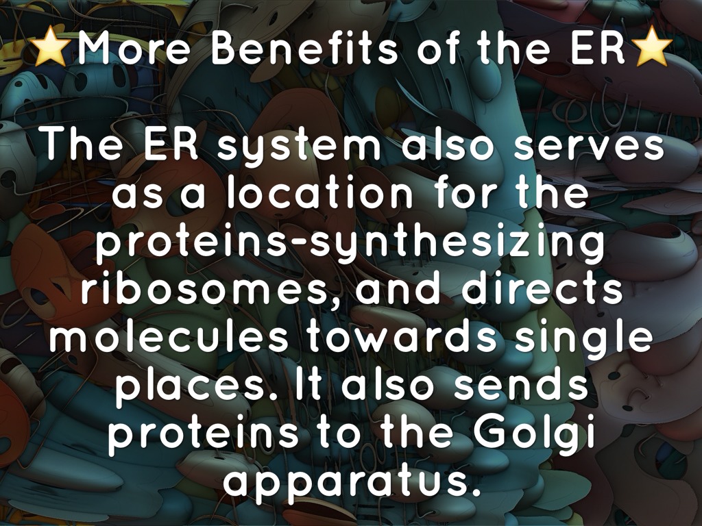 The ER system also serves as a location for the proteins-synthesizing ribosomes, and directs molecules towards single places. It also sends proteins to the Golgi apparatus.