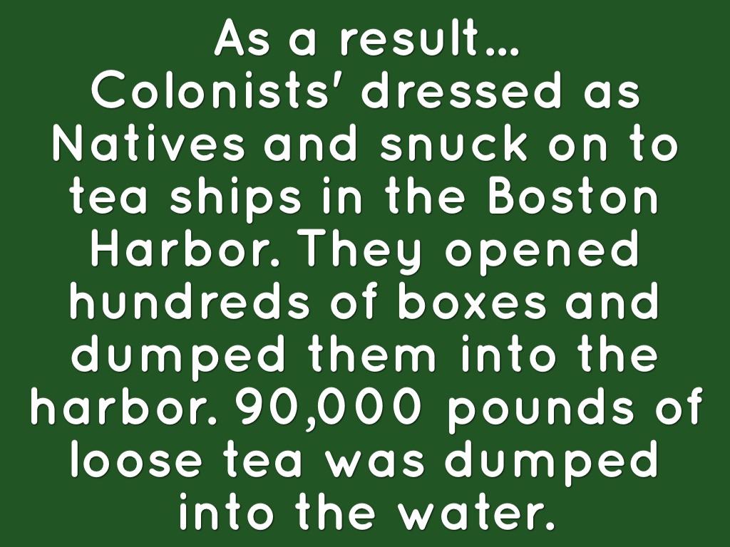 Colonists' dressed as Natives and snuck on to tea ships in the Boston Harbor. They opened hundreds of boxes and dumped them into the harbor. 90,000 pounds of loose tea was dumped into the water.