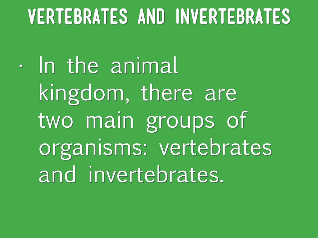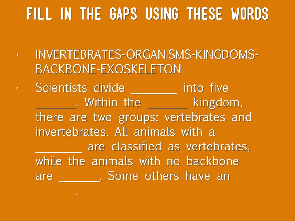 Scientists divide ________ into five _______. Within the _______ kingdom, there are two groups: vertebrates and invertebrates. All animals with a ________ are classified as vertebrates, while the animals with no backbone are _______. Some others have an _______.