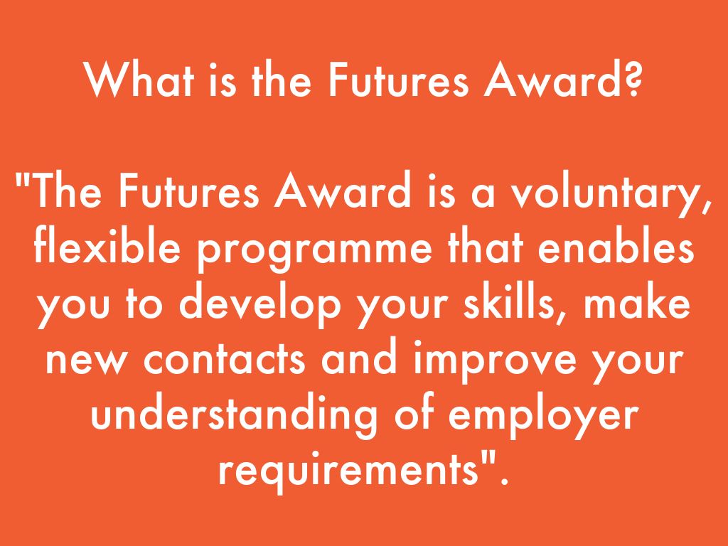 "The Futures Award is a voluntary, flexible programme that enables you to develop your skills, make new contacts and improve your understanding of employer requirements".