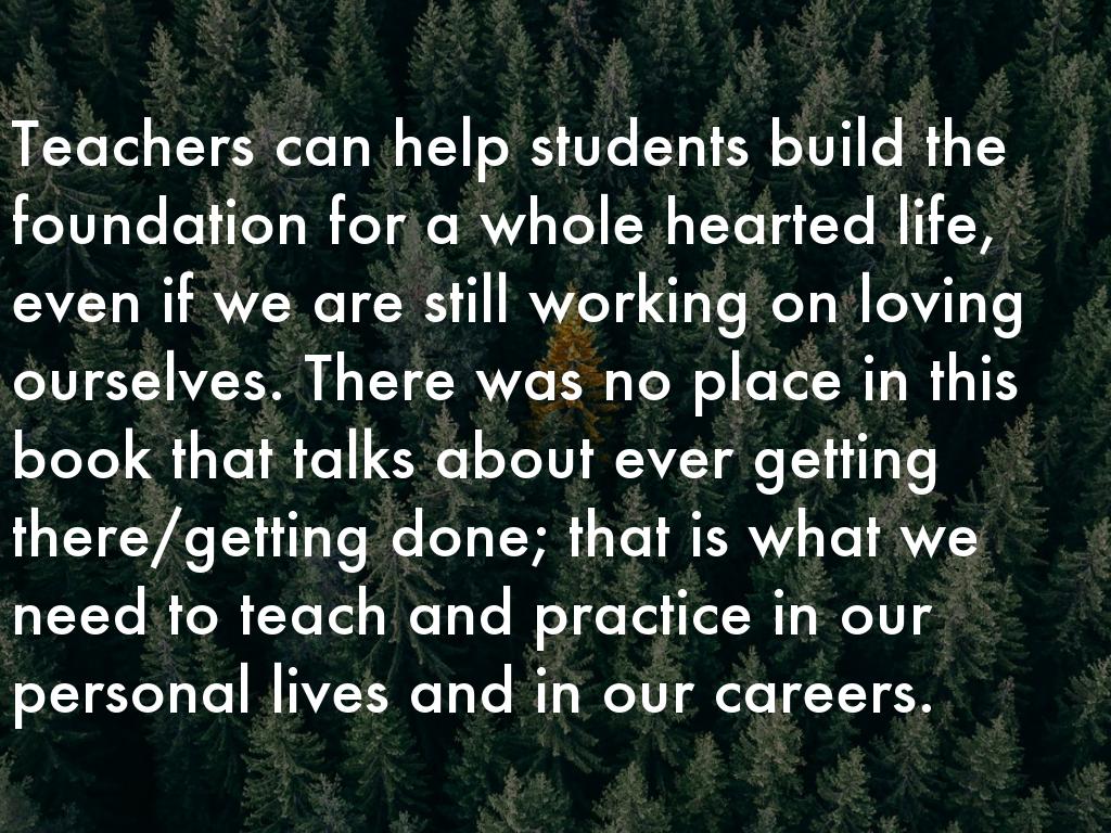 Teachers can help students build the foundation for a whole hearted life, even if we are still working on loving ourselves. There was no place in this book that talks about ever getting there/getting done; that is what we need to teach and practice in our personal lives and in our careers.
