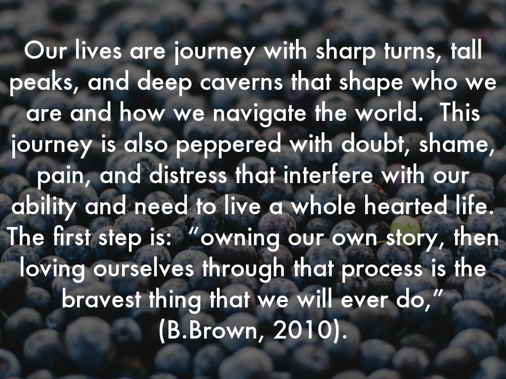 Our lives are journey with sharp turns, tall peaks, and deep caverns that shape who we are and how we navigate the world. This journey is also peppered with doubt, shame, pain, and distress that interfere with our ability and need to live a whole hearted life. The first step is: “owning our own story, then loving ourselves through that process is the bravest thing that we will ever do,” (B.Brown, 2010).