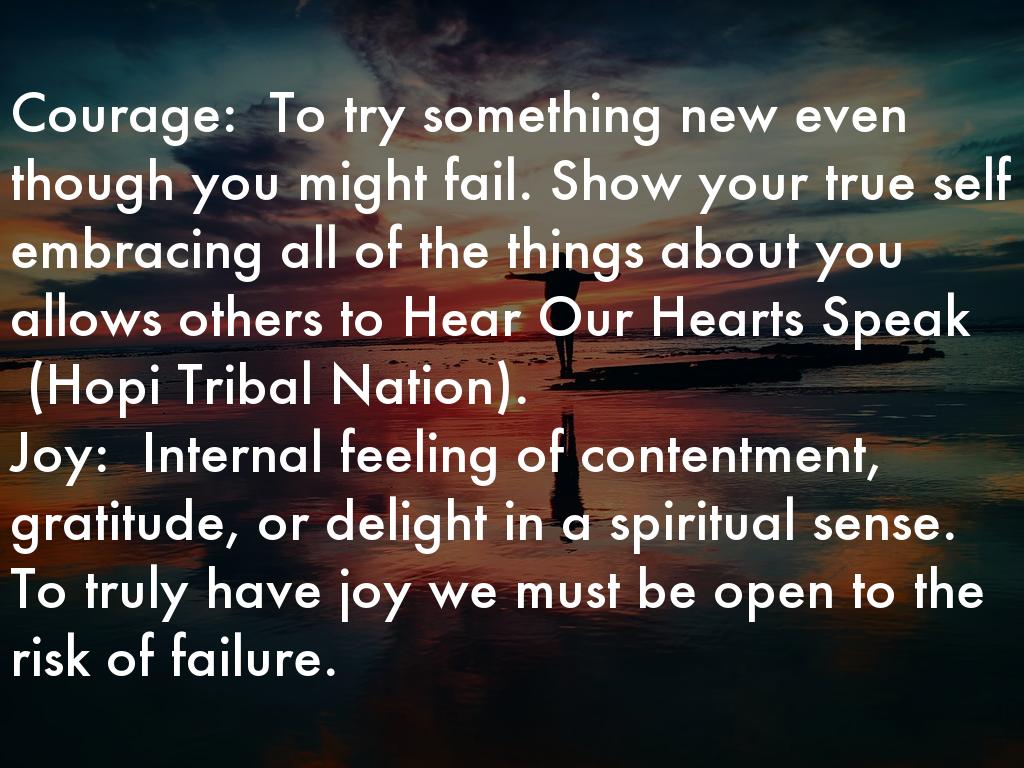 Courage: To try something new even though you might fail. Show your true self embracing all of the things about you allows others to Hear Our Hearts Speak (Hopi Tribal Nation). Joy: Internal feeling of contentment, gratitude, or delight in a spiritual sense. To truly have joy we must be open to the risk of failure.