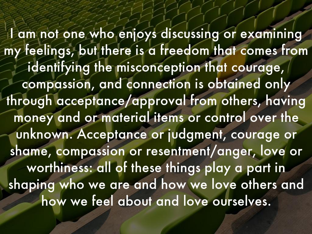I am not one who enjoys discussing or examining my feelings, but there is a freedom that comes from identifying the misconception that courage, compassion, and connection is obtained only through acceptance/approval from others, having money and or material items or control over the unknown. Acceptance or judgment, courage or shame, compassion or resentment/anger, love or worthiness: all of these things play a part in shaping who we are and how we love others and how we feel about and love ourselves.