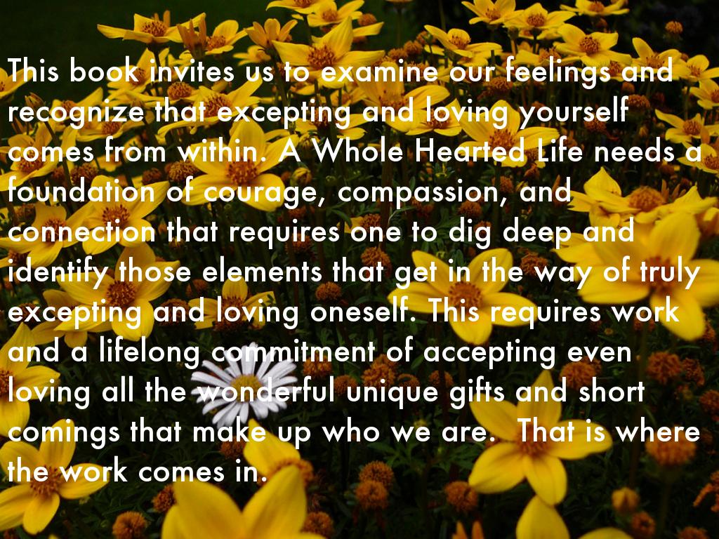 This book invites us to examine our feelings and recognize that excepting and loving yourself comes from within. A Whole Hearted Life needs a foundation of courage, compassion, and connection that requires one to dig deep and identify those elements that get in the way of truly excepting and loving oneself. This requires work and a lifelong commitment of accepting even loving all the wonderful unique gifts and short comings that make up who we are. That is where the work comes in.