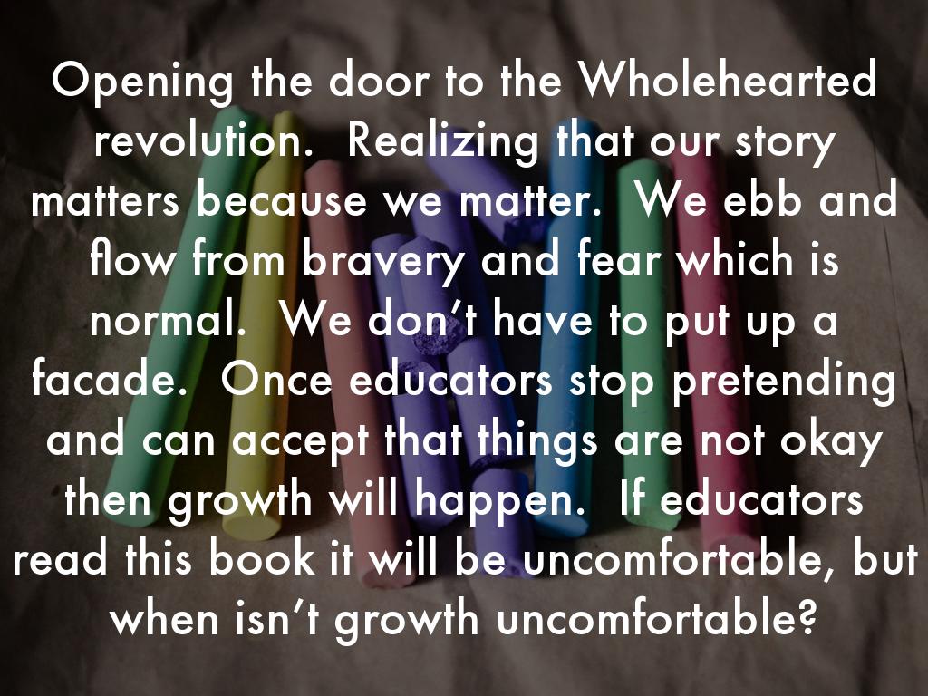 Opening the door to the Wholehearted revolution. Realizing that our story matters because we matter. We ebb and flow from bravery and fear which is normal. We don’t have to put up a facade. Once educators stop pretending and can accept that things are not okay then growth will happen. If educators read this book it will be uncomfortable, but when isn’t growth uncomfortable?