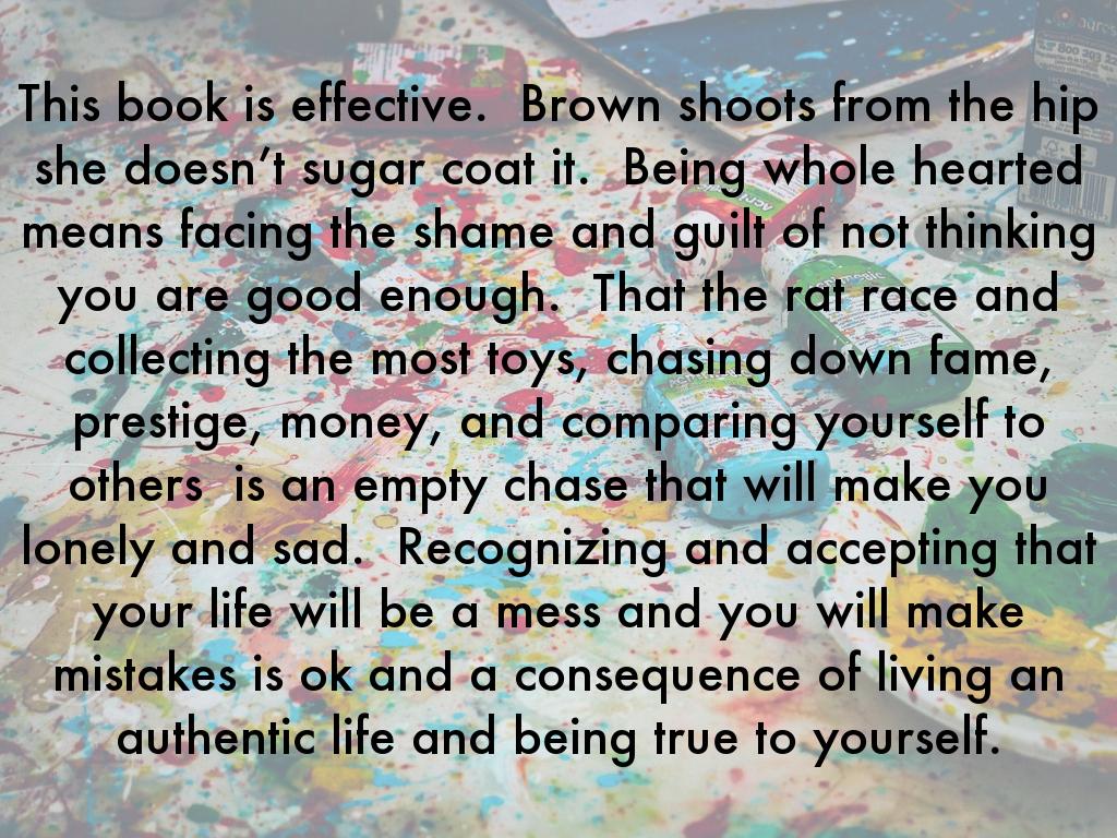This book is effective. Brown shoots from the hip she doesn’t sugar coat it. Being whole hearted means facing the shame and guilt of not thinking you are good enough. That the rat race and collecting the most toys, chasing down fame, prestige, money, and comparing yourself to others is an empty chase that will make you lonely and sad. Recognizing and accepting that your life will be a mess and you will make mistakes is ok and a consequence of living an authentic life and being true to yourself.