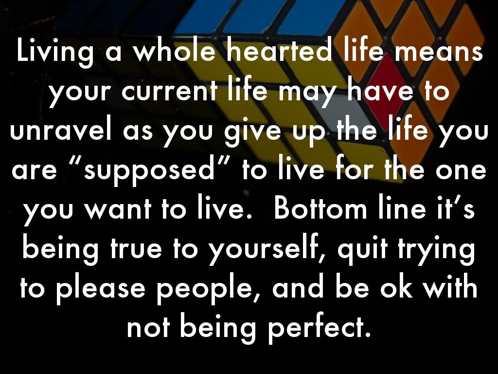 Living a whole hearted life means your current life may have to unravel as you give up the life you are “supposed” to live for the one you want to live. Bottom line it’s being true to yourself, quit trying to please people, and be ok with not being perfect.