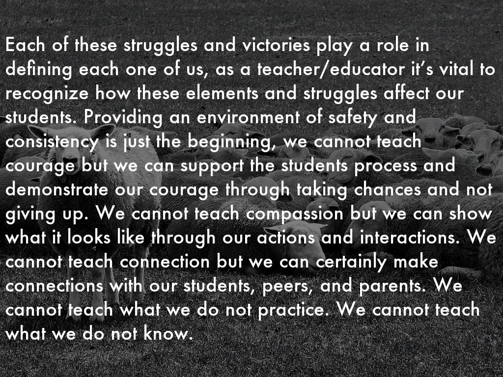 Each of these struggles and victories play a role in defining each one of us, as a teacher/educator it’s vital to recognize how these elements and struggles affect our students. Providing an environment of safety and consistency is just the beginning, we cannot teach courage but we can support the students process and demonstrate our courage through taking chances and not giving up. We cannot teach compassion but we can show what it looks like through our actions and interactions. We cannot teach connection but we can certainly make connections with our students, peers, and parents. We cannot teach what we do not practice. We cannot teach what we do not know.