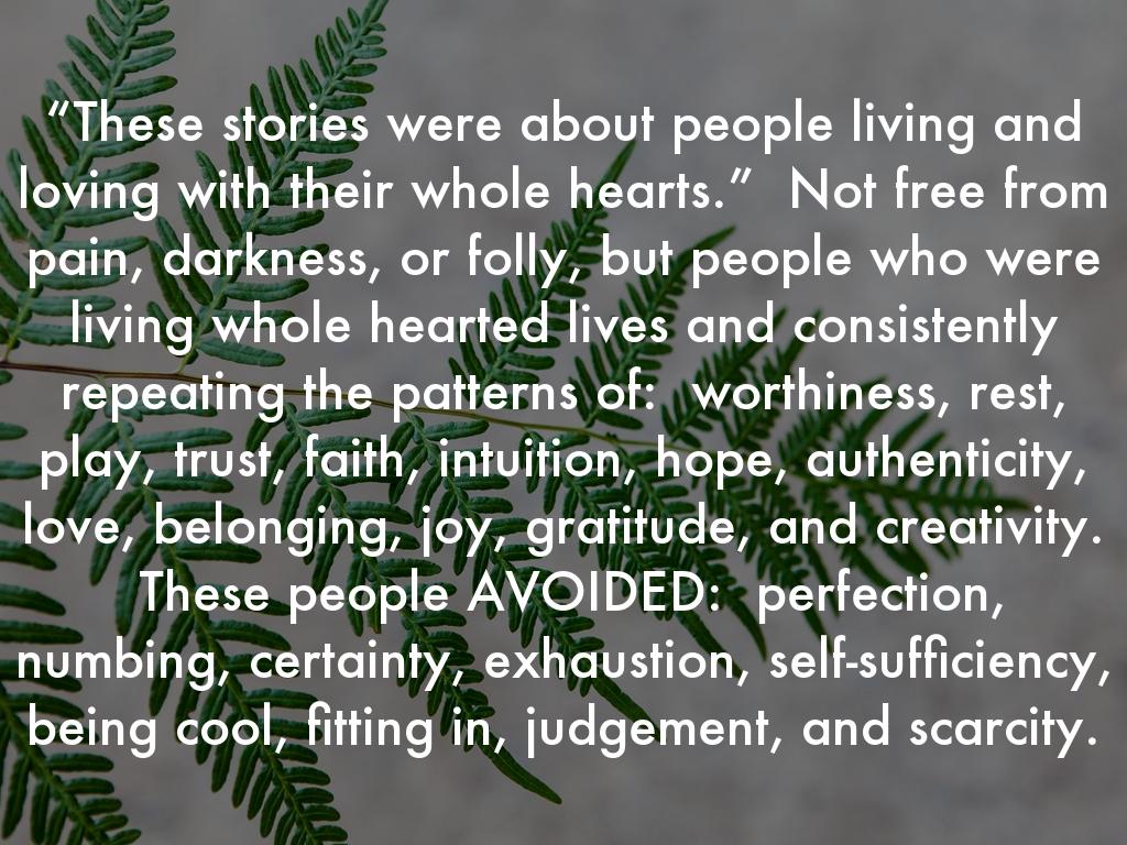 “These stories were about people living and loving with their whole hearts.” Not free from pain, darkness, or folly, but people who were living whole hearted lives and consistently repeating the patterns of: worthiness, rest, play, trust, faith, intuition, hope, authenticity, love, belonging, joy, gratitude, and creativity. These people AVOIDED: perfection, numbing, certainty, exhaustion, self-sufficiency, being cool, fitting in, judgement, and scarcity.