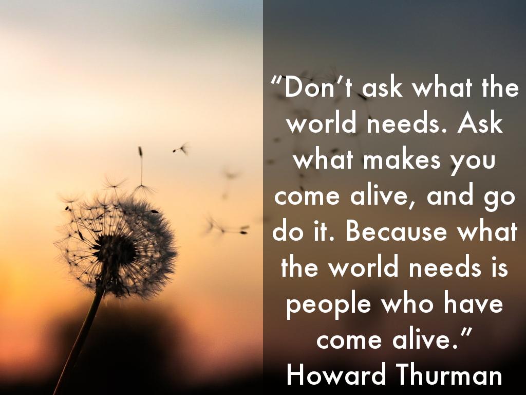 “Don’t ask what the world needs. Ask what makes you come alive, and go do it. Because what the world needs is people who have come alive.” Howard Thurman