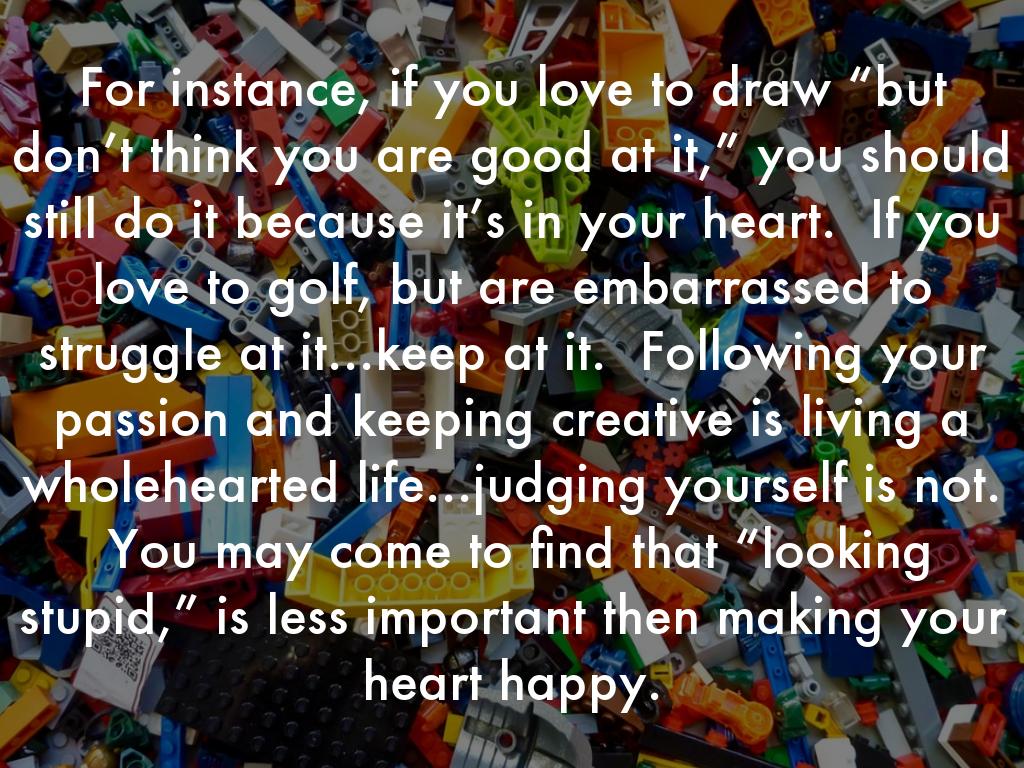 For instance, if you love to draw “but don’t think you are good at it,” you should still do it because it’s in your heart. If you love to golf, but are embarrassed to struggle at it...keep at it. Following your passion and keeping creative is living a wholehearted life...judging yourself is not. You may come to find that “looking stupid,” is less important then making your heart happy.
