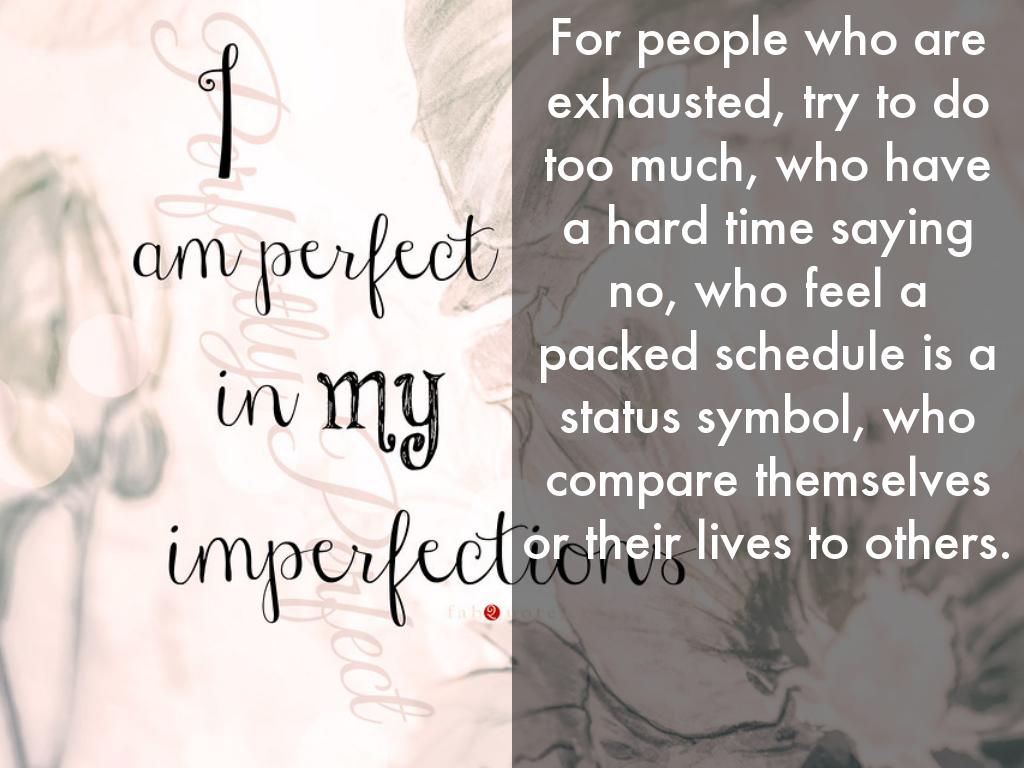 For people who are exhausted, try to do too much, who have a hard time saying no, who feel a packed schedule is a status symbol, who compare themselves or their lives to others.