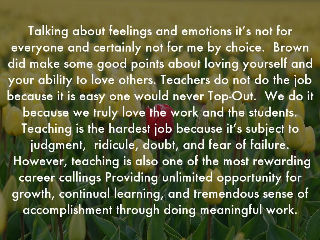 Talking about feelings and emotions it’s not for everyone and certainly not for me by choice. Brown did make some good points about loving yourself and your ability to love others. Teachers do not do the job because it is easy one would never Top-Out. We do it because we truly love the work and the students. Teaching is the hardest job because it’s subject to judgment, ridicule, doubt, and fear of failure. However, teaching is also one of the most rewarding career callings Providing unlimited opportunity for growth, continual learning, and tremendous sense of accomplishment through doing meaningful work.