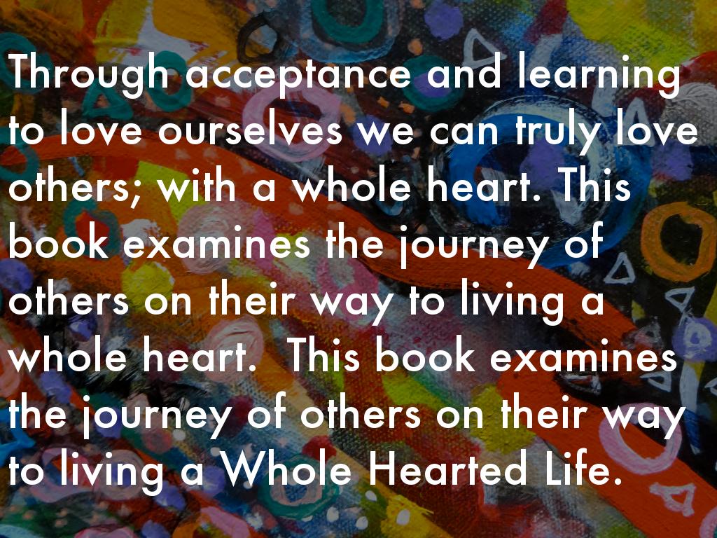 Through acceptance and learning to love ourselves we can truly love others; with a whole heart. This book examines the journey of others on their way to living a whole heart. This book examines the journey of others on their way to living a Whole Hearted Life.