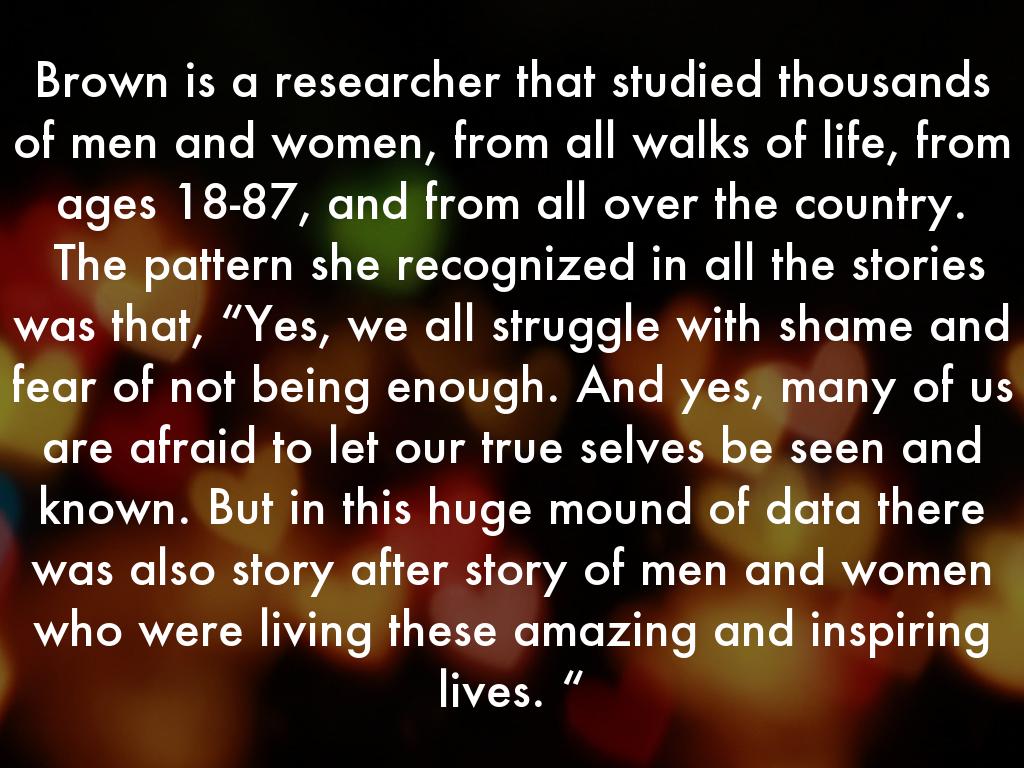 Brown is a researcher that studied thousands of men and women, from all walks of life, from ages 18-87, and from all over the country. The pattern she recognized in all the stories was that, “Yes, we all struggle with shame and fear of not being enough. And yes, many of us are afraid to let our true selves be seen and known. But in this huge mound of data there was also story after story of men and women who were living these amazing and inspiring lives. “