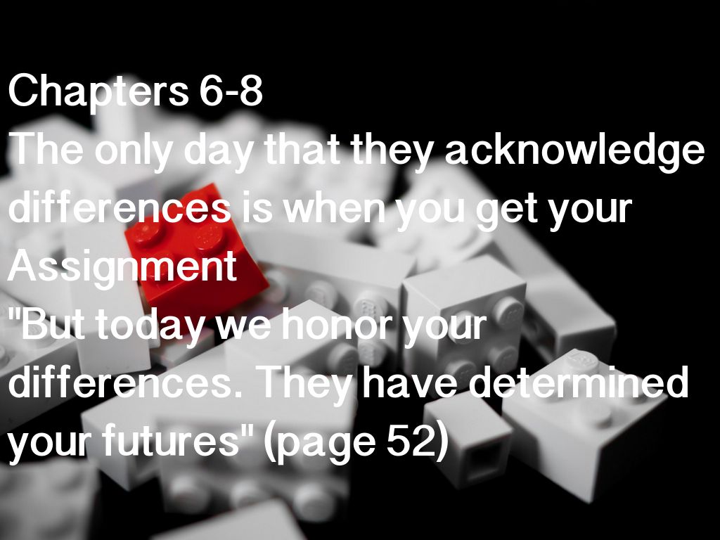 Chapters 6-8 The only day that they acknowledge differences is when you get your Assignment "But today we honor your differences. They have determined your futures" (page 52)