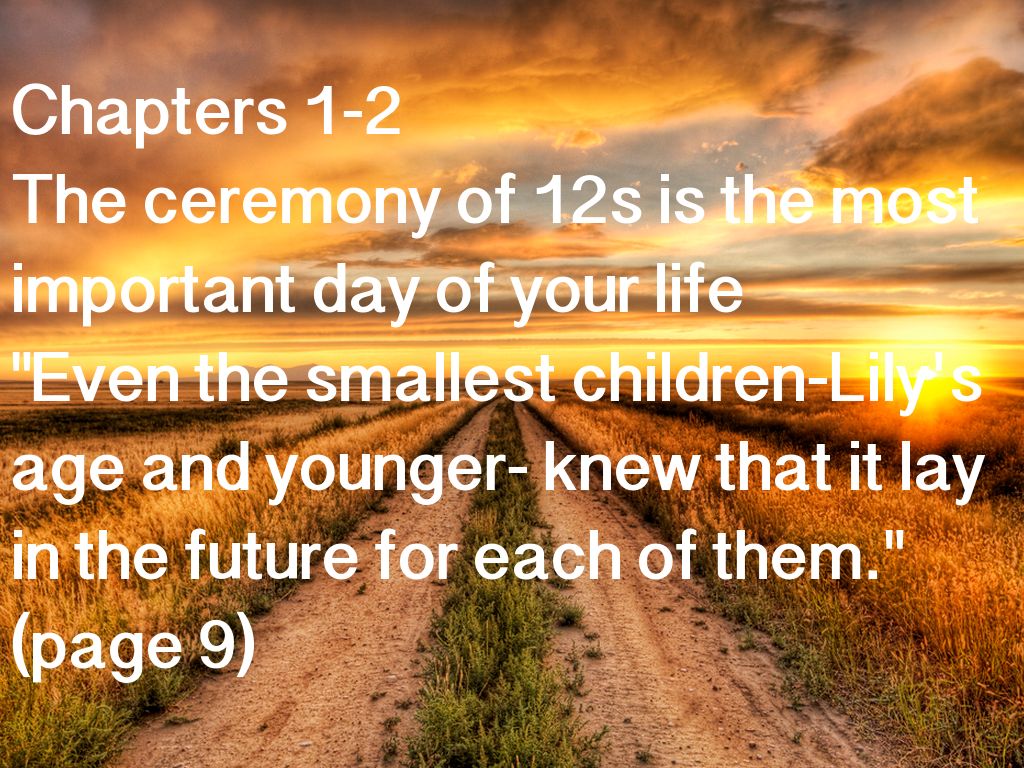 Chapters 1-2 The ceremony of 12s is the most important day of your life "Even the smallest children-Lily's age and younger- knew that it lay in the future for each of them." (page 9)