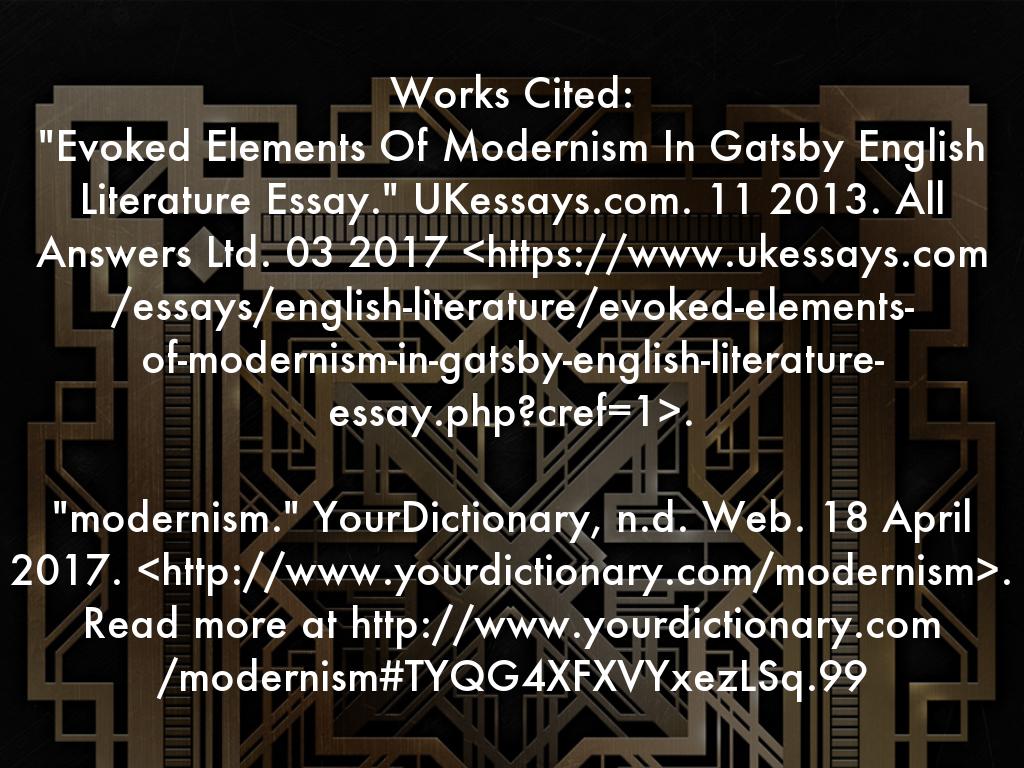 "Evoked Elements Of Modernism In Gatsby English Literature Essay." UKessays.com. 11 2013. All Answers Ltd. 03 2017 .