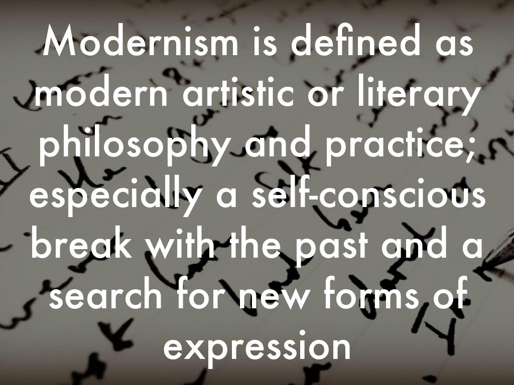 Modernism is defined as modern artistic or literary philosophy and practice; especially a self-conscious break with the past and a search for new forms of expression