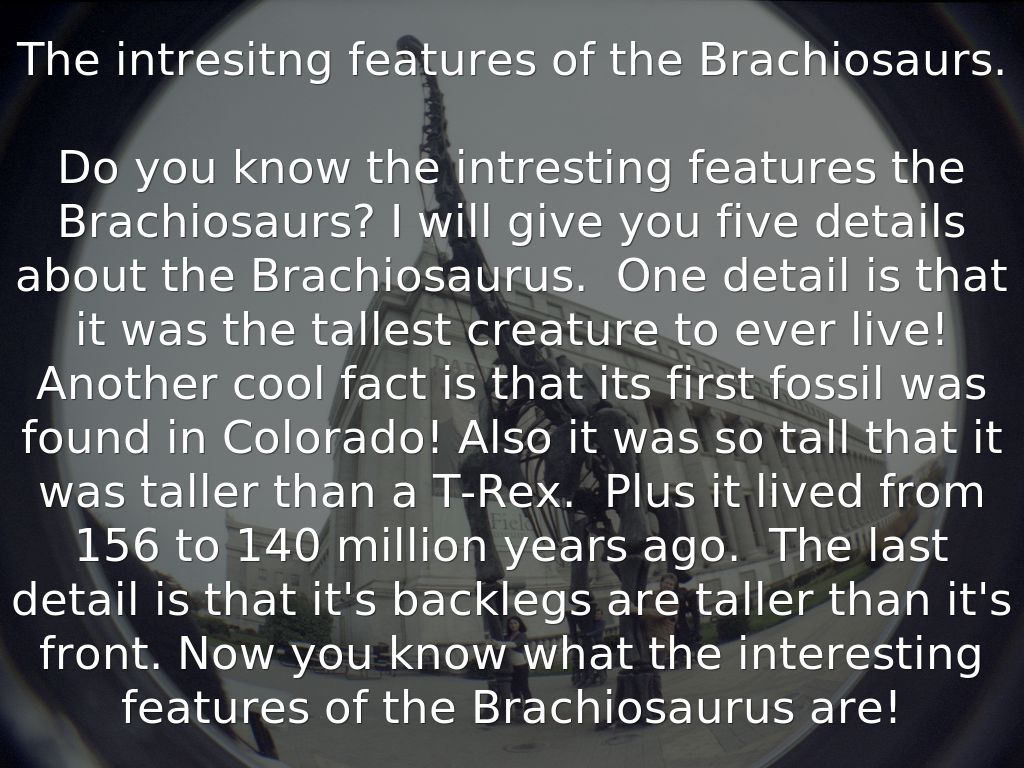 Do you know the intresting features the Brachiosaurs? I will give you five details about the Brachiosaurus. One detail is that it was the tallest creature to ever live! Another cool fact is that its first fossil was found in Colorado! Also it was so tall that it was taller than a T-Rex. Plus it lived from 156 to 140 million years ago. The last detail is that it's backlegs are taller than it's front. Now you know what the interesting features of the Brachiosaurus are!
