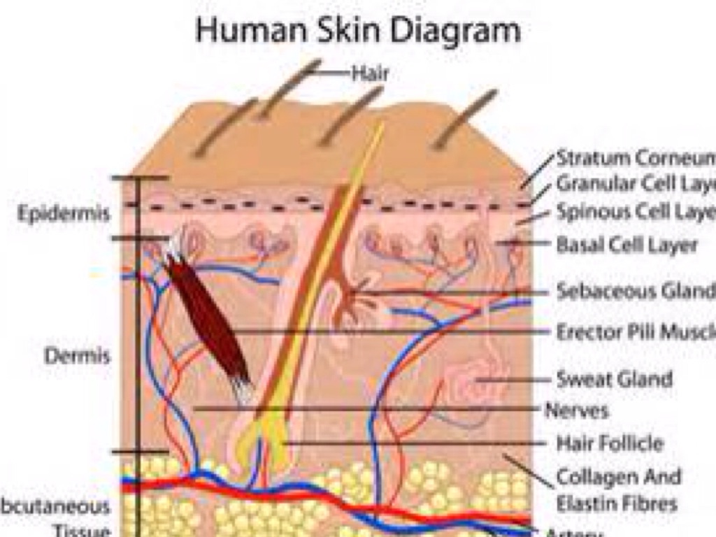 The integumentary system is an organ system consisting the skin hair and nails and exocrine glands. Skin forms the body's outer covering and dorms a barrier to protect the body from chemicals, diseases, UV light and physical damage. Hair & nails extend from the skin to reinforce the skin and protect it. The epidermis is the outermost layer of skin. The dermis is the deep layer if the skin under the epidermis.