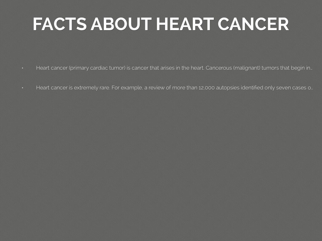 Heart cancer is extremely rare. For example, a review of more than 12,000 autopsies identified only seven cases of primary cardiac tumor — an incidence of less than 0.1 percent.