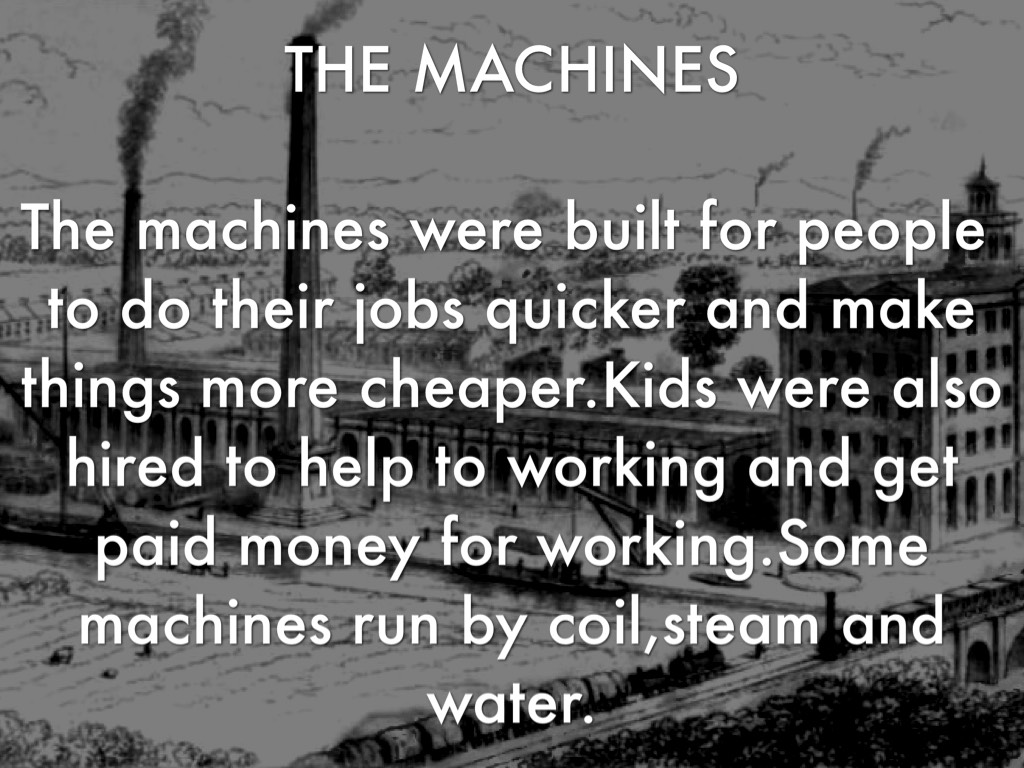 The machines were built for people to do their jobs quicker and make things more cheaper.Kids were also hired to help to working and get paid money for working.Some machines run by coil,steam and water.