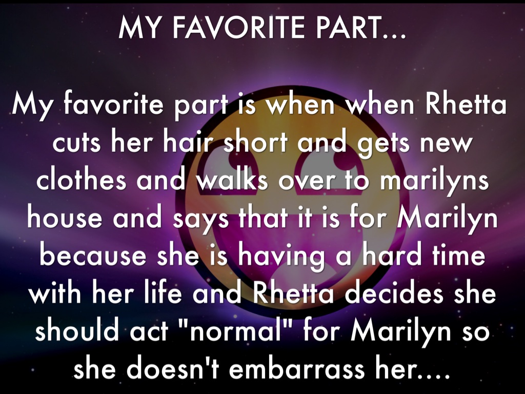 My favorite part is when when Rhetta cuts her hair short and gets new clothes and walks over to marilyns house and says that it is for Marilyn because she is having a hard time with her life and Rhetta decides she should act "normal" for Marilyn so she doesn't embarrass her.