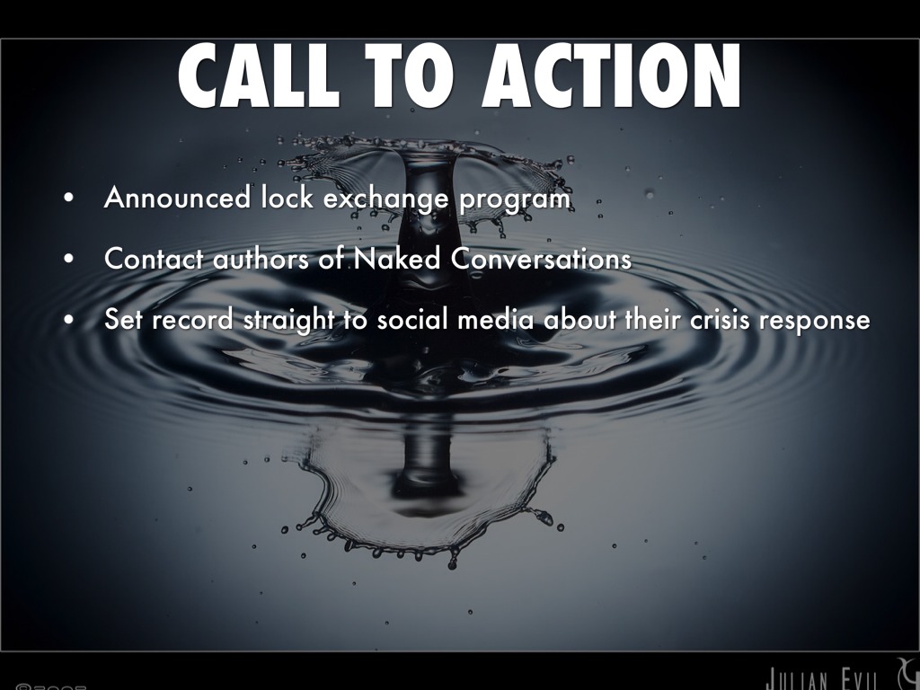 The company's head of public regulations, Donna M. Tocci Connected with the authors of Naked Conversations to set the record straight about the company's example of what not to do in the face of a crisis.