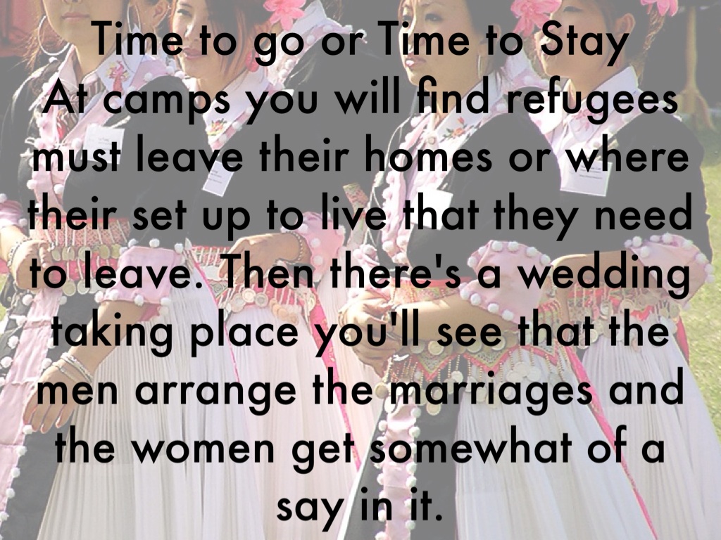 At camps you will find refugees must leave their homes or where their set up to live that they need to leave. Then there's a wedding taking place you'll see that the men arrange the marriages and the women get somewhat of a say in it.