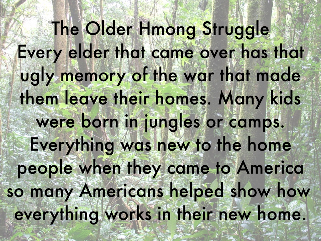 Every elder that came over has that ugly memory of the war that made them leave their homes. Many kids were born in jungles or camps. Everything was new to Hmong people when they came to America. Many Americans helped show how everything works in their new home.