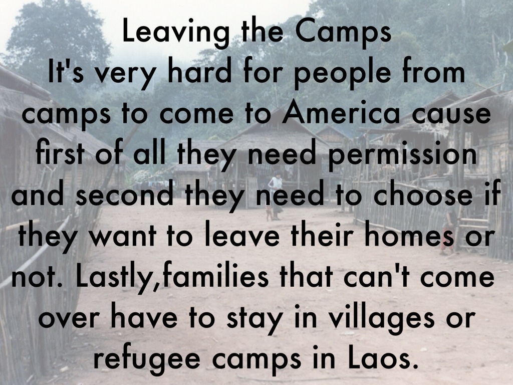 It's very hard for people from camps to come to America cause first of all they need permission and second they need to choose if they want to leave their homes or not. Lastly,families that can't come over have to stay in villages or refugee camps in Laos.