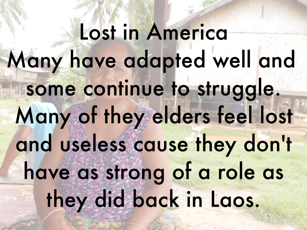 Many have adapted well and some continue to struggle. Many of the elders feel lost and useless cause they don't have as strong of a role as they did back in Laos.