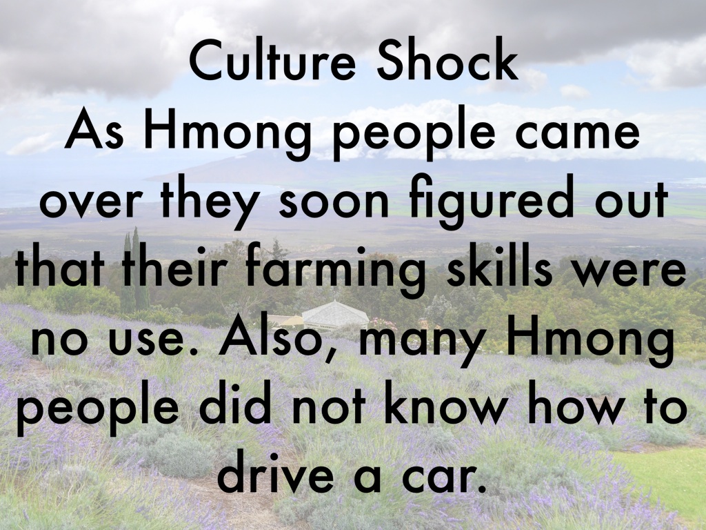 As Hmong people came over they soon figured out that their farming skills were no use. Also, many Hmong people did not know how to drive a car.
