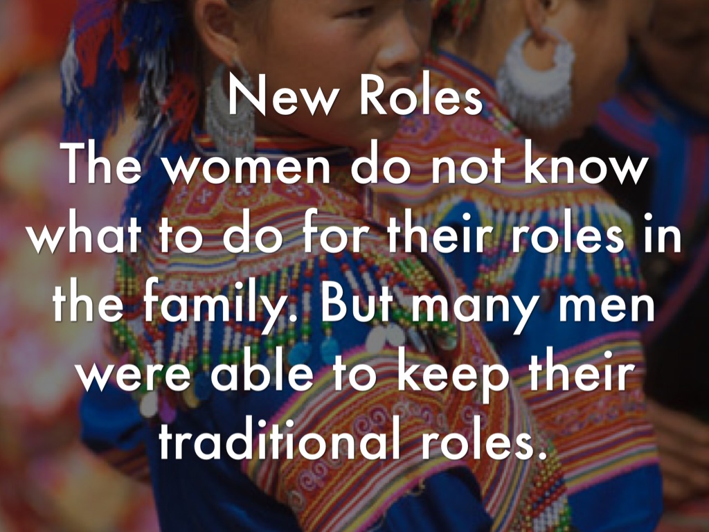 The women do not know what to do for their roles in the family. But many men were able to keep their traditional roles.
