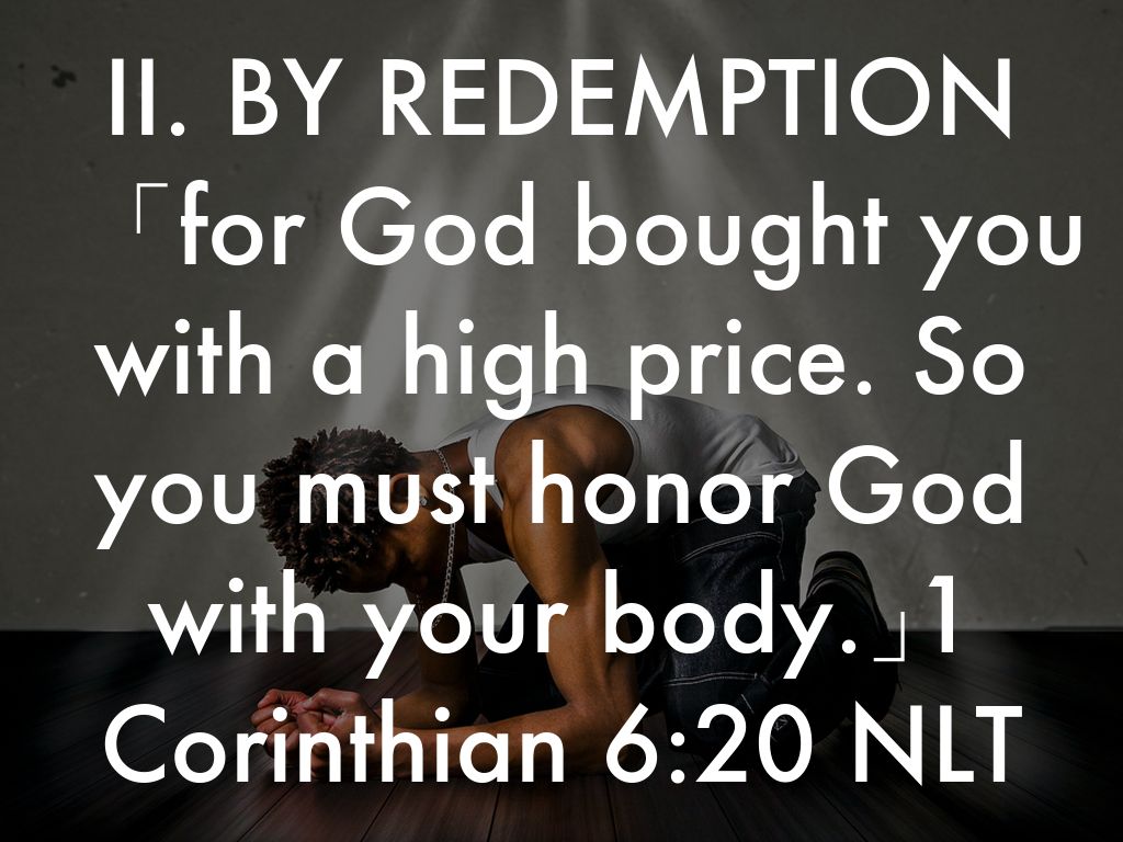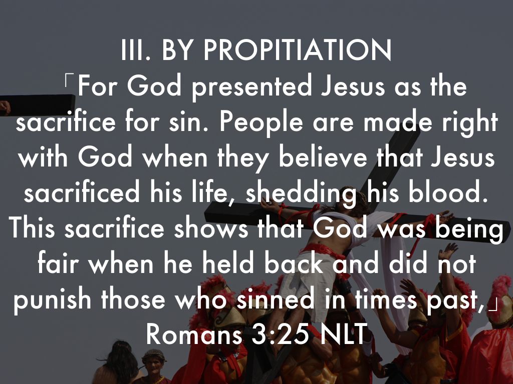 III. BY PROPITIATION 「For God presented Jesus as the sacrifice for sin. People are made right with God when they believe that Jesus sacrificed his life, shedding his blood. This sacrifice shows that God was being fair when he held back and did not punish those who sinned in times past,」Romans 3:25 NLT