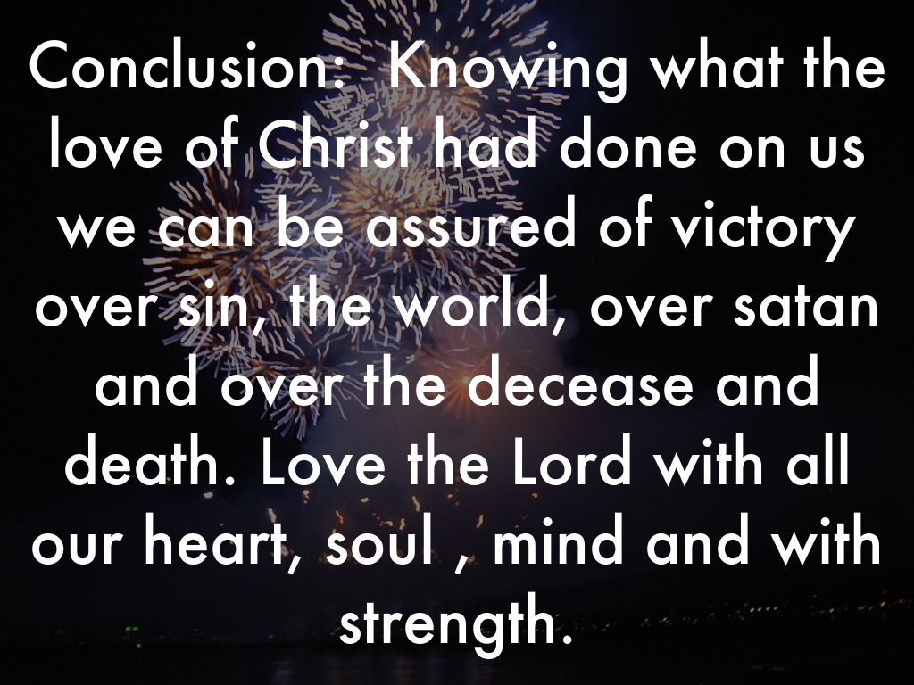 Conclusion: Knowing what the love of Christ had done on us we can be assured of victory over sin, the world, over satan and over the decease and death. Love the Lord with all our heart, soul , mind and with strength.