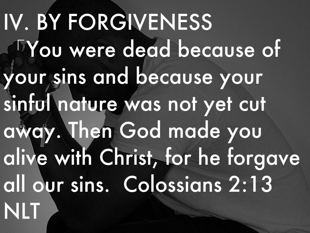 IV. BY FORGIVENESS 「You were dead because of your sins and because your sinful nature was not yet cut away. Then God made you alive with Christ, for he forgave all our sins. Colossians 2:13 NLT