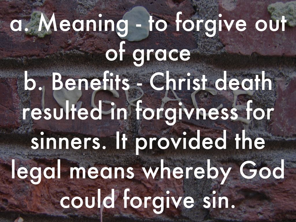 a. Meaning - to forgive out of grace b. Benefits - Christ death resulted in forgivness for sinners. It provided the legal means whereby God could forgive sin.