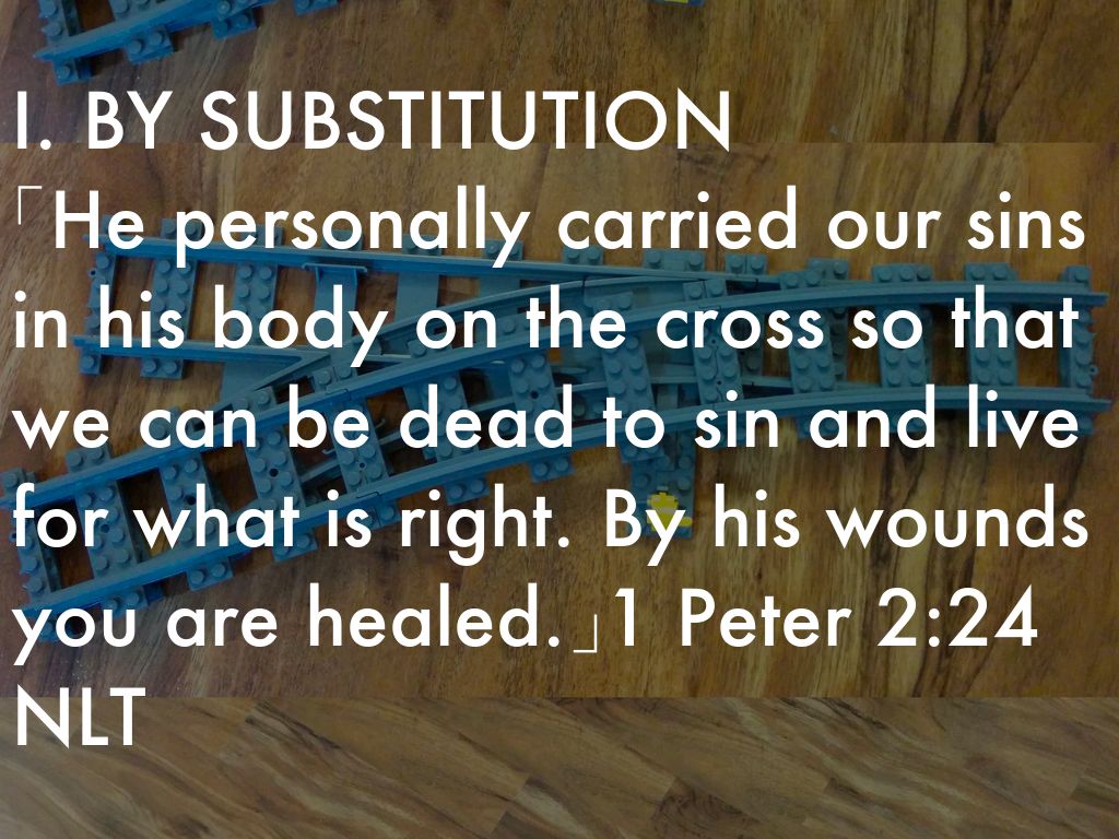 I. BY SUBSTITUTION 「He personally carried our sins in his body on the cross so that we can be dead to sin and live for what is right. By his wounds you are healed.」1 Peter 2:24 NLT