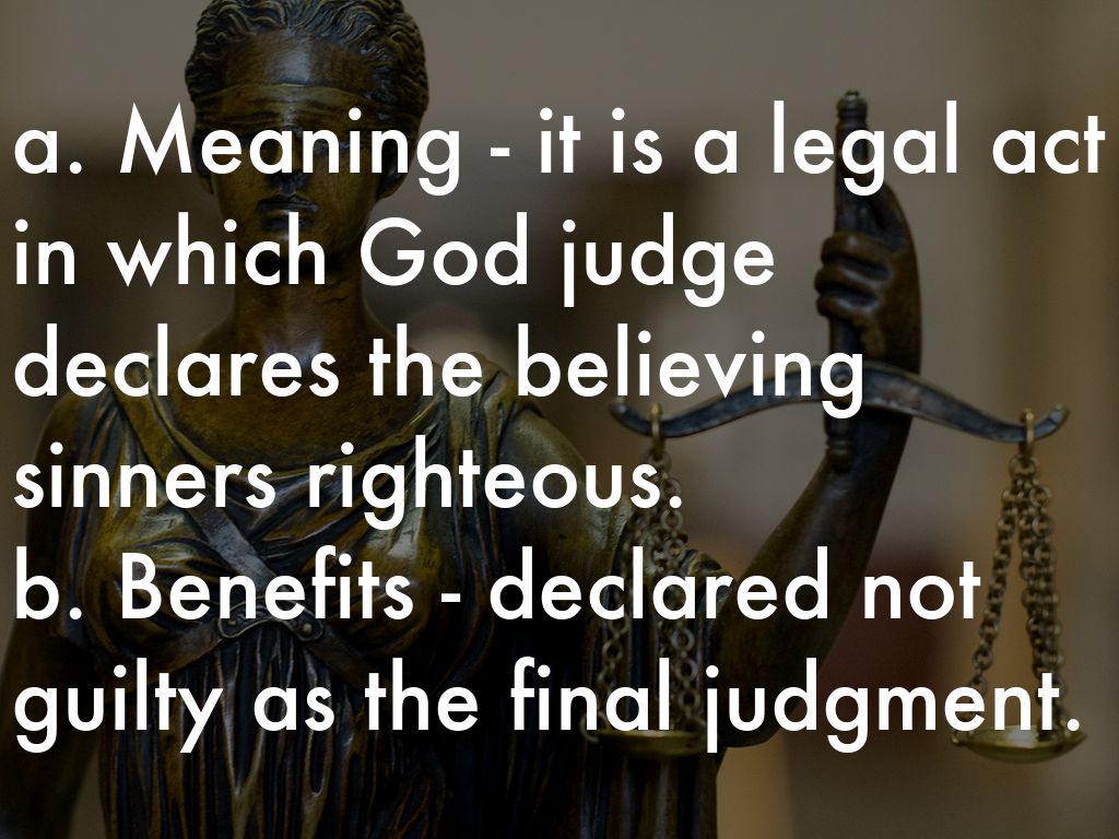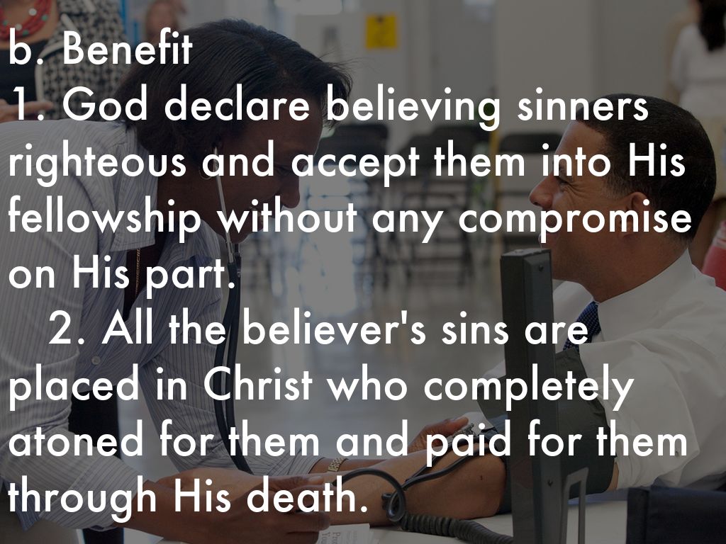 b. Benefit 1. God declare believing sinners righteous and accept them into His fellowship without any compromise on His part. 2. All the believer's sins are placed in Christ who completely atoned for them and paid for them through His death.