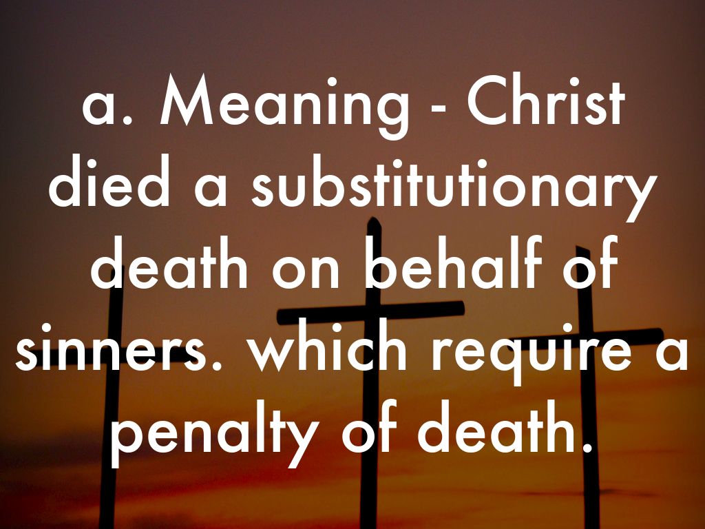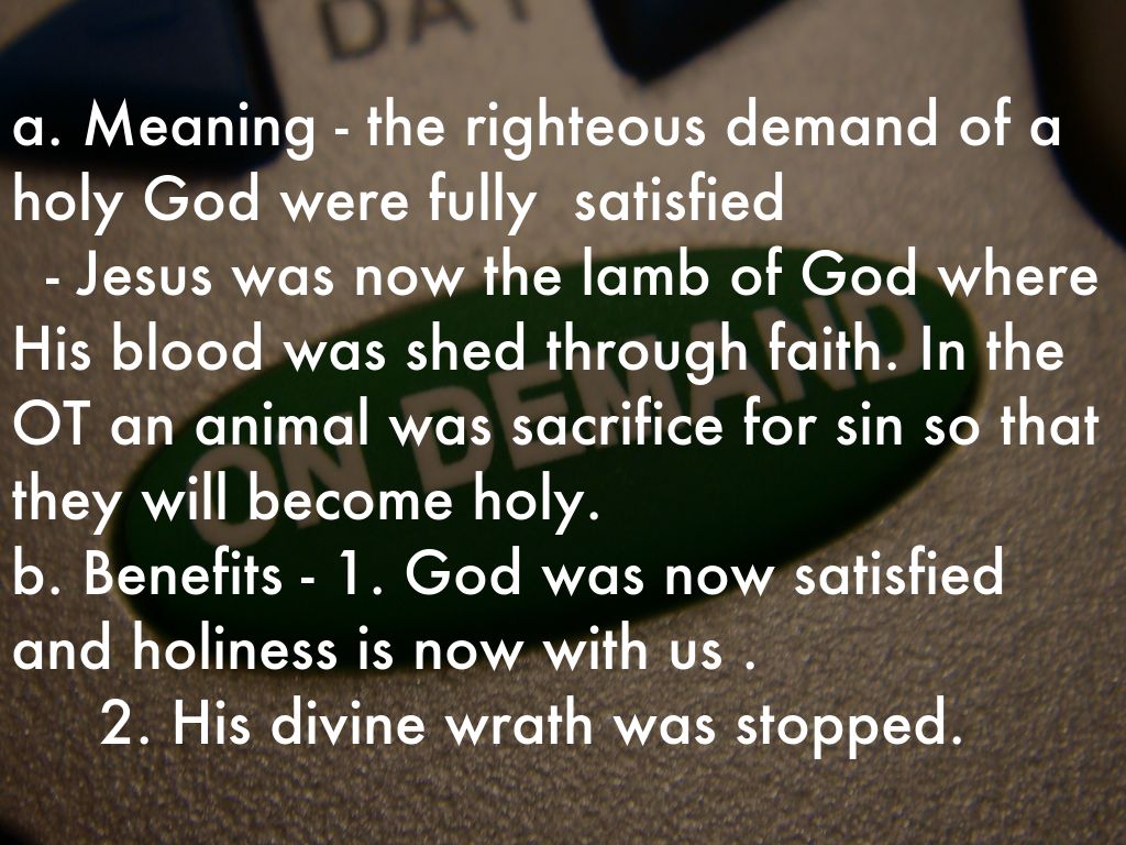 a. Meaning - the righteous demand of a holy God were fully satisfied - Jesus was now the lamb of God where His blood was shed through faith. In the OT an animal was sacrifice for sin so that they will become holy. b. Benefits - 1. God was now satisfied and holiness is now with us . 2. His divine wrath was stopped.